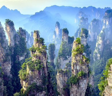 - Zhangjiajie is renowned for its surreal sandstone pillars, misty forests, and dramatic landscapes. Its scenery famously inspired the floating mountains in the movie Avatar and serves as a gateway to the UNESCO-listed Wulingyuan area.